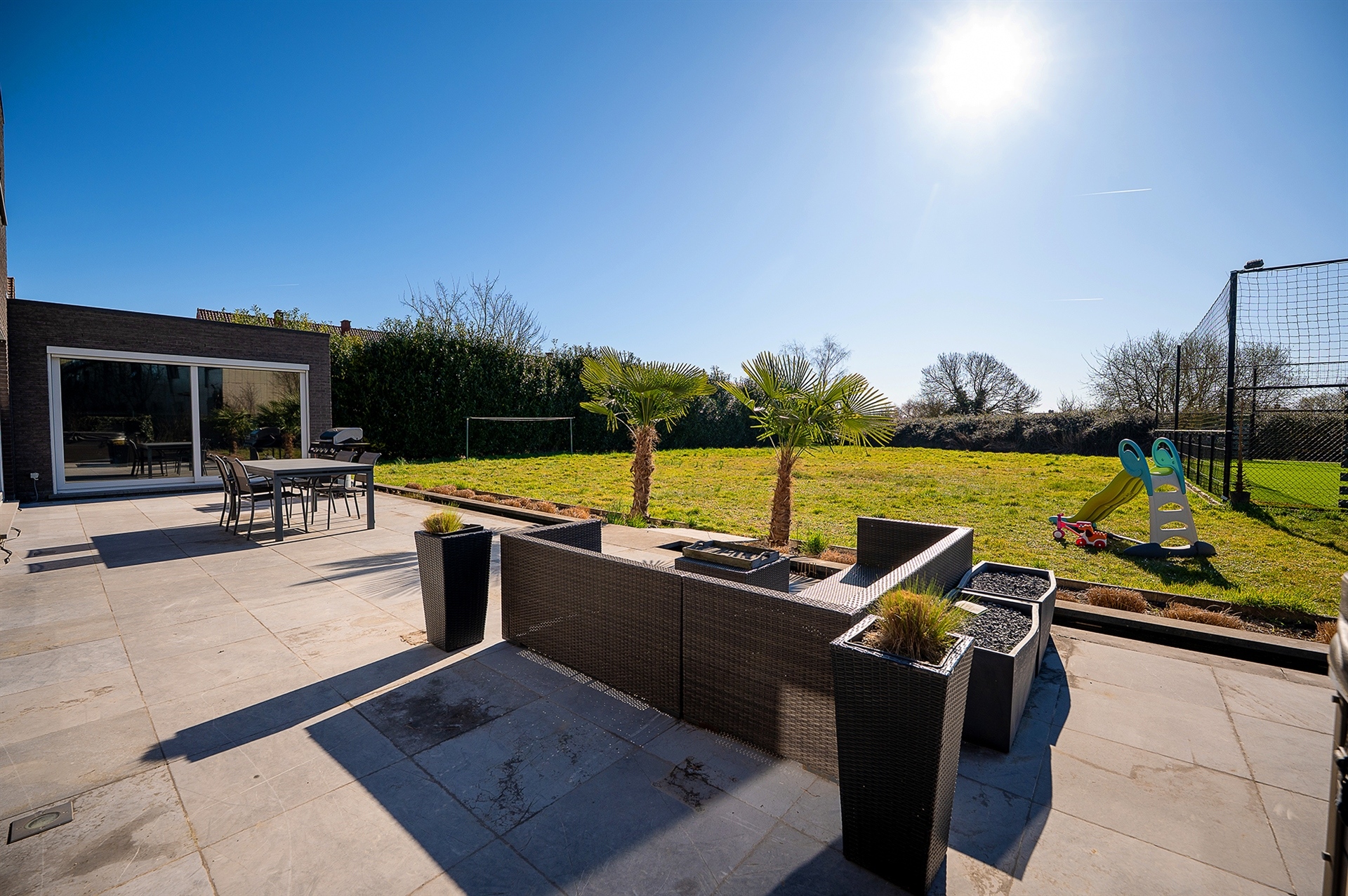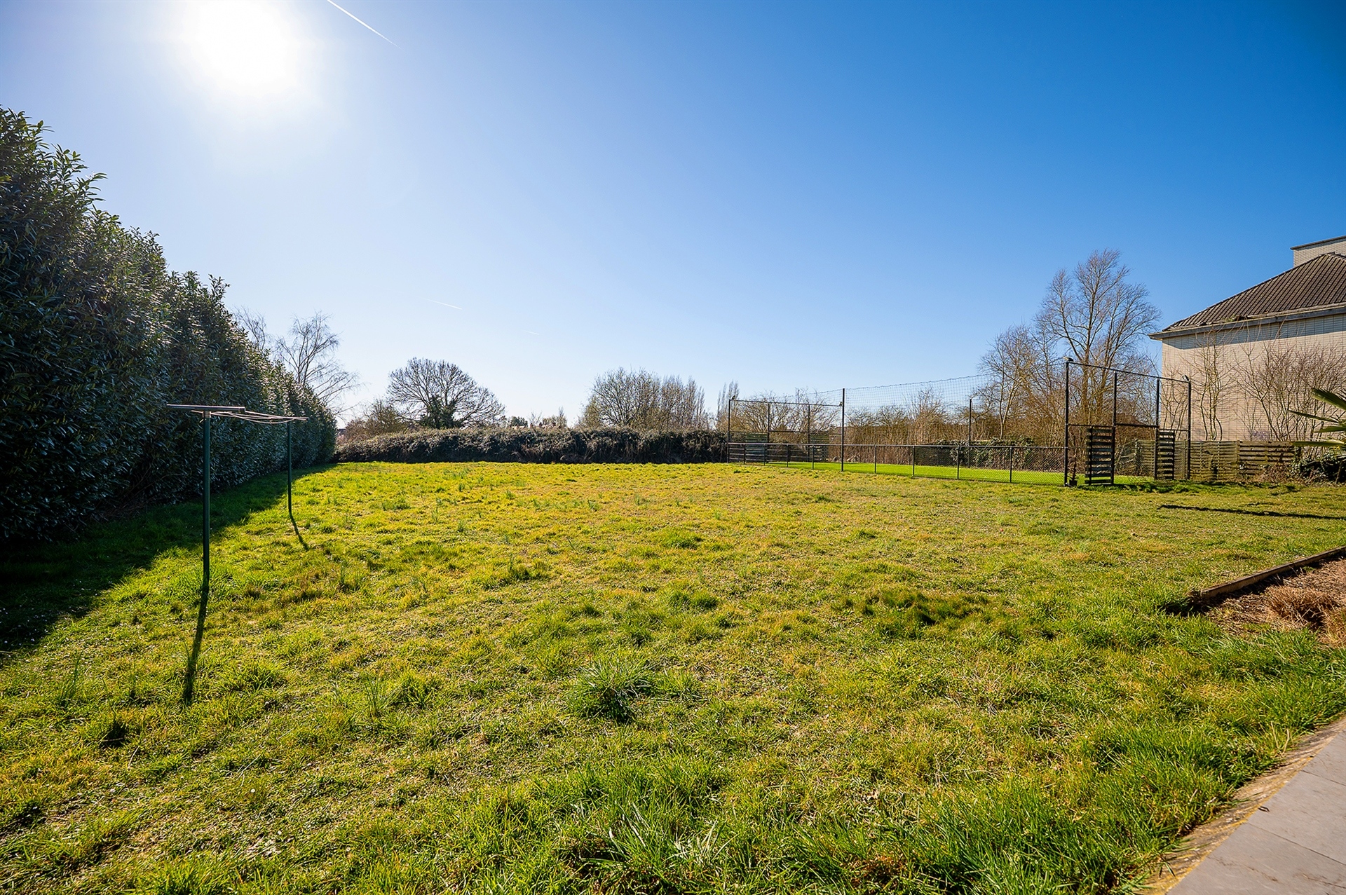Le jardin, bien orienté, accueille une grande terrasse, un terrain de foot synthétique et, en façade, un bassin d’eau. Plusieurs emplacements de parking privatifs complètent l’ensemble.