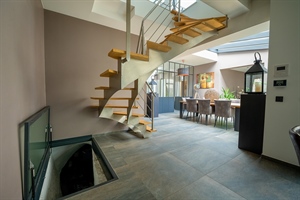 L’atmosphère intérieure, portée par des matériaux nobles — bois chaleureux, verrières esprit atelier, escaliers design, carrelages formats XL — compose un cadre de vie à la fois contemporain et accueillant.
