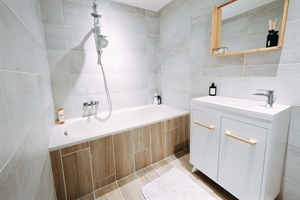 À l'étage, deux belles chambres assurent un espace nuit confortable, tandis qu'une salle de bain moderne, équipée dune baignoire-douche, complète idéalement ce niveau.
