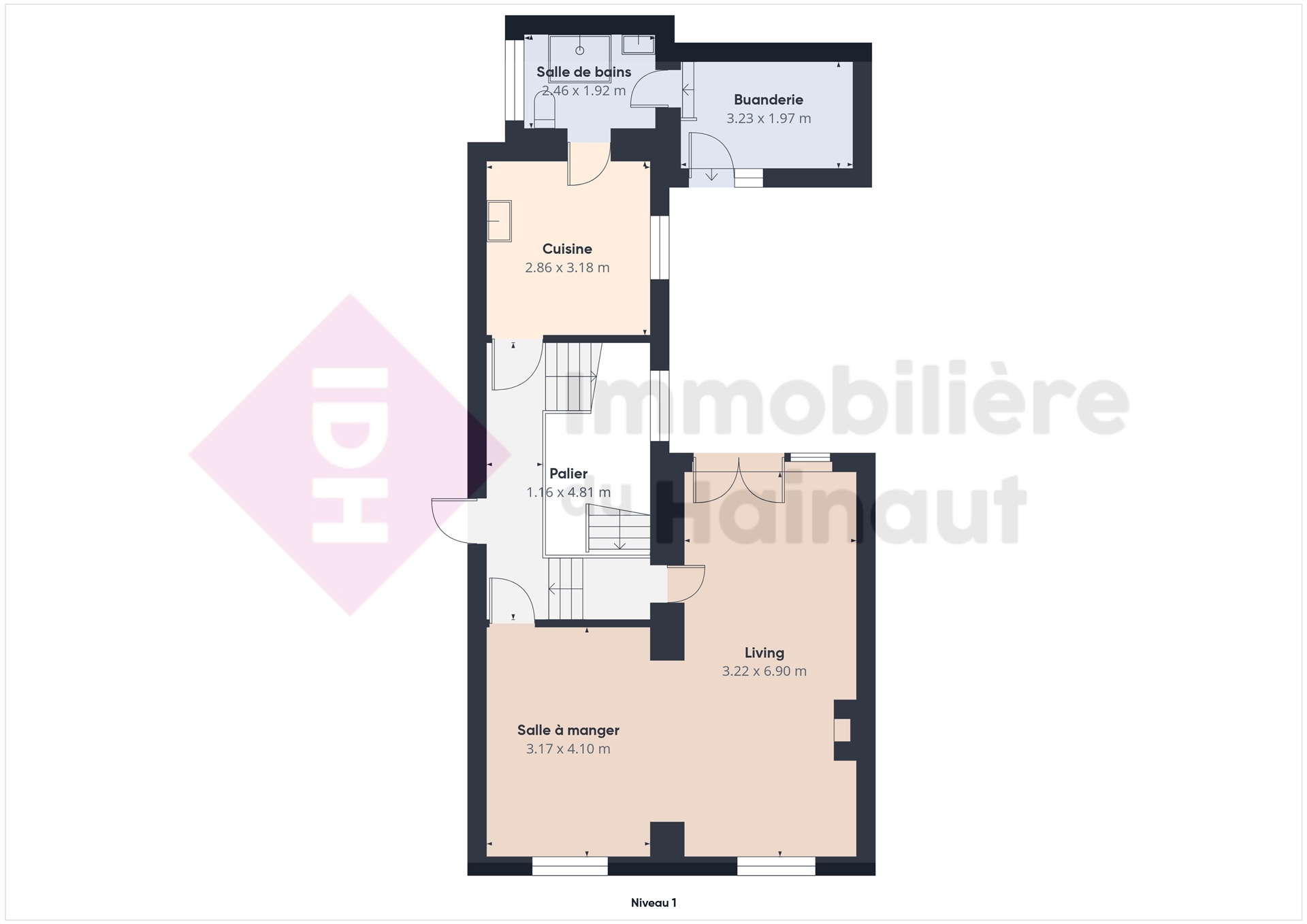 - 1er : Living avec accès à la terrasse intérieure, cuisine, salle de douche avec WC et accès buanderie.