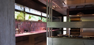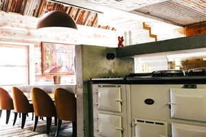 Un espace cuisine exceptionnel : plan de travail en granit rose, cuisinière aga, frigo USA, cave à vin, etc ...