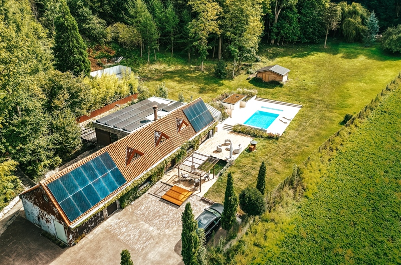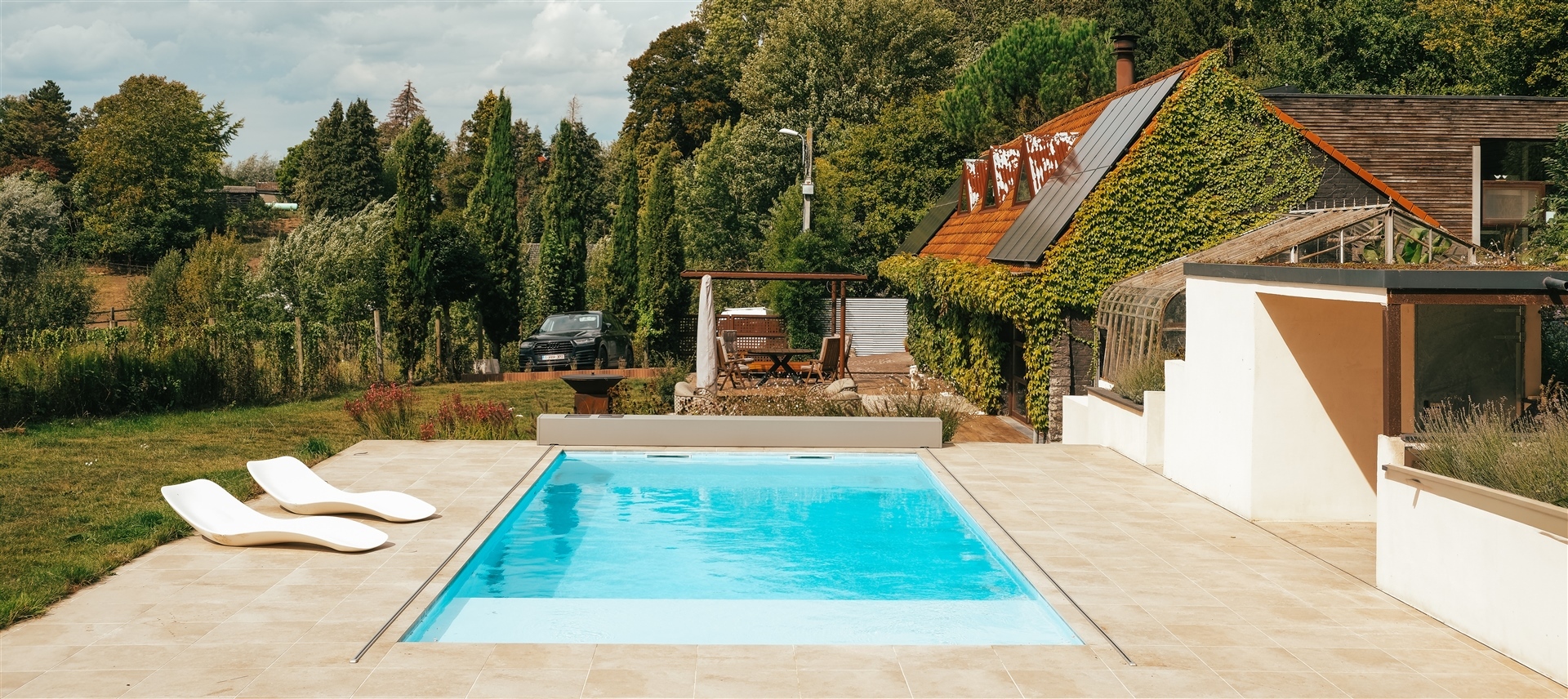 Les extérieurs : ce sont les vacances !! terrasses, serre, piscine extérieur (coverseal), jardin, bois.
