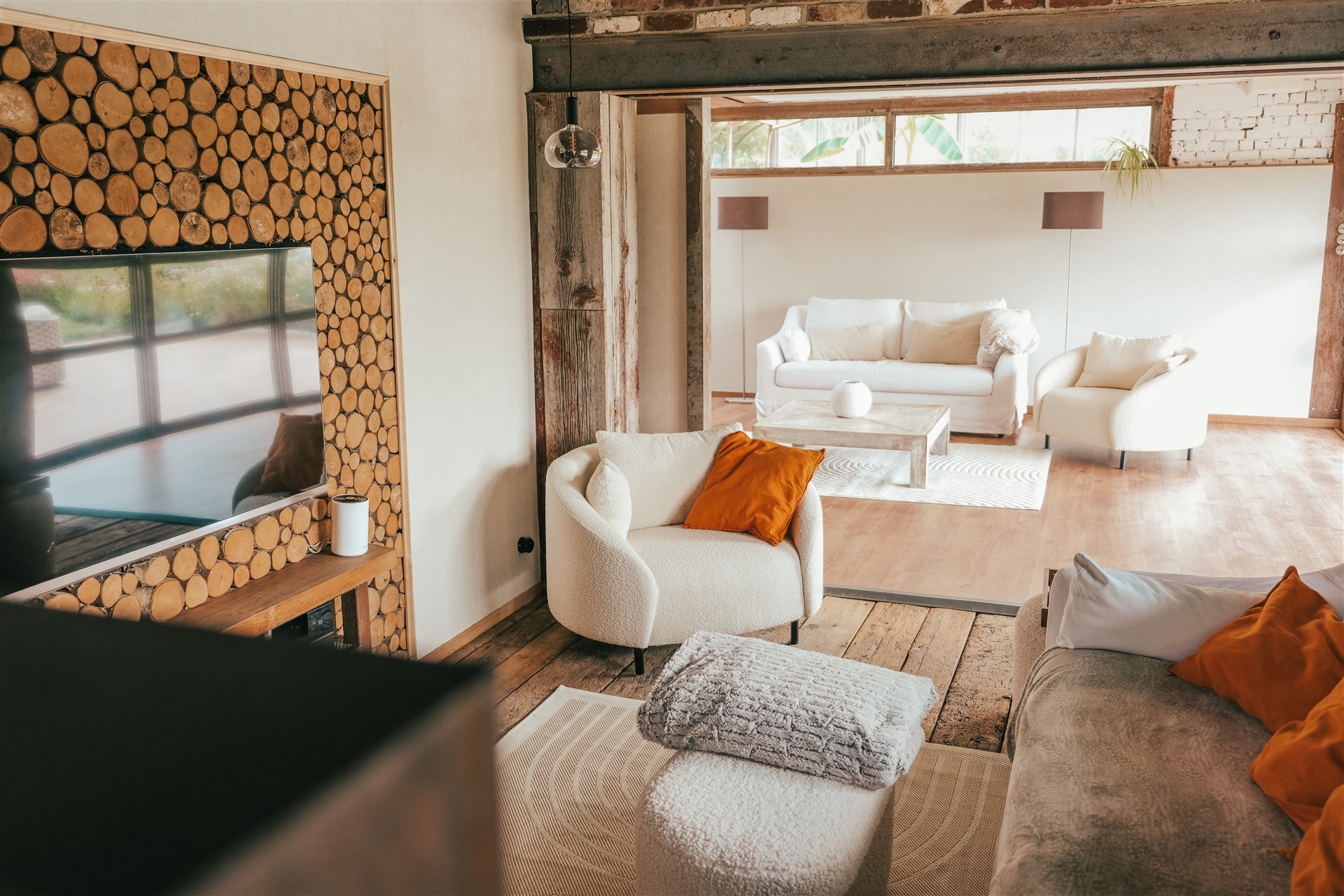Développant une superficie de +/- 300 m2 , elle se compose d'un large hall d'entrée, vous accèderez ensuite à la pièce de vie principale : aux différentes hauteurs sous plafonds, cheminée feu de bois, table en béton, salon tv, salon de réception, etc ... le tout orienté sur le jardin plein sud.